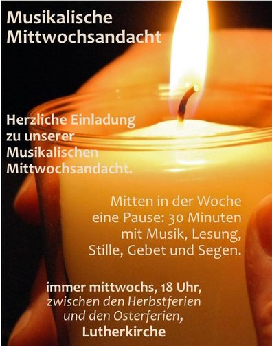 Die Musikalischen Mittwochsandachten finden von Herbst bis Ostern jeden Mittwoch, 18 Uhr, in der Lutherkirche statt. Eine kleine Auszeit vom Alltag - singen, hören, beten! Herzlich Willkommen!
