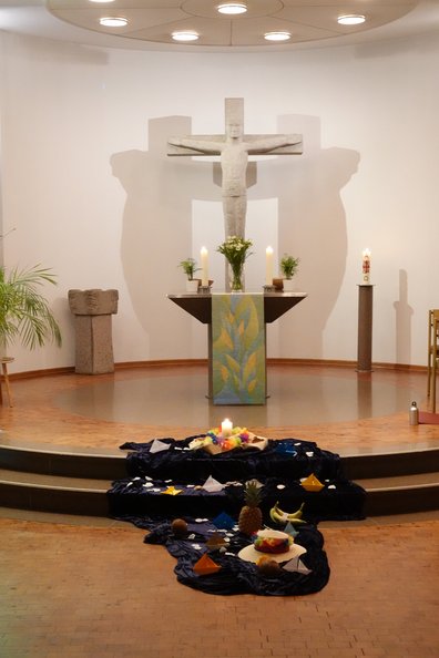 Highlight des Gottesdienstes war aber das bereits im Titel des Gottesdienstes präsente "Band des Friedens". Dieses wurde im Gottesdienst gemeinschaftlich aus verschiedenen Farbtüchern geknüpft und brachte unsere Verbundenheit mit allen Menschen, die sich nach Frieden sehnen, zum Ausdruck.