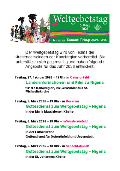 Am Freitag, den 6. März 2026, feiern Menschen in über 150 Ländern der Erde den Weltgebetstag aus Nigeria. „Kommt! Bringt eure Last.“ lautet ihr hoffnungsverheißendes Motto, angelehnt an Matthäus 11,28-30.